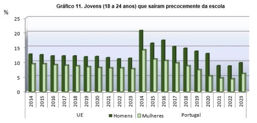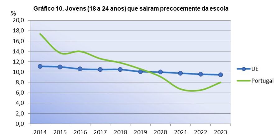 Nos últimos anos, a proporção de jovens portugueses que saíram precocemente da escola, ou seja, da população de 18 a 24 anos cujo nível de escolaridade não ultrapassa o 3º ciclo do ensino básico (ISCED 0-2) e que já não frequenta escola ou outro tipo de formação, tem sido inferior à da média observada na UE. De facto, os dados indicam que, no geral, este abandono escolar precoce tem vindo a diminuir progressivamente, mas com maior incidência em Portugal, porquanto a proporção de jovens que saíram precocemente da escola diminuiu de 17,4% em 2014 para 8% em 2023, valor inferior ao da média dos países da UE que, em 2023, registou 9,5% (Gráfico 10).