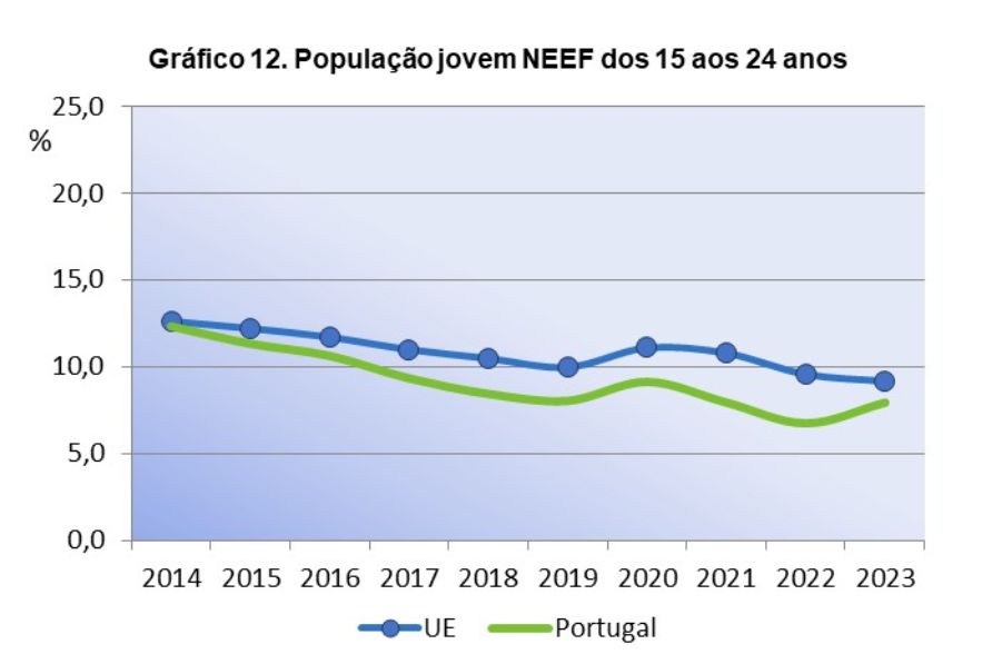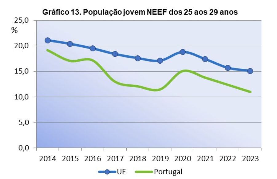 Considerando, ainda, a percentagem de jovens, entre os 16 e os 29 anos de idade, que não se encontrava a trabalhar, nem a estudar ou a frequentar outro tipo de formação (NEEF), evidencia-se, nos últimos anos, um decréscimo quer em Portugal, quer na UE, apesar de uma ligeira subida, em 2020, ano marcado pelo início da pandemia de COVID-19. De salientar que, em 2023, a percentagem de população portuguesa NEEF, entre os 16 e os 29 anos, permaneceu inferior à da média europeia (8,9% em Portugal face a 11,2% na UE) (Gráficos 12 e 13).
