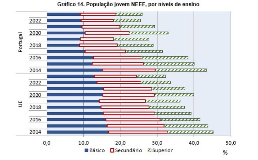 Por último, considerando esta população jovem NEEF por níveis de ensino, observa-se que, em 2023, a proporção da população portuguesa com o nível de escolaridade do ensino secundário (9,7%) apresentou uma percentagem ligeiramente superior à da que detém o ensino básico (9,1%) ou o ensino superior (7,1%). Em relação à média dos países da União, em 2023, verificou-se uma tendência diferente, com os jovens NEEF de 16 a 29 anos que apenas têm o ensino básico a registar a percentagem mais elevada (12,9%), logo seguida pelos jovens NEEF com o ensino secundário (11,6%) e pelos do ensino superior que apresentaram o valor com menor expressão (7,8%). De assinalar que, na UE, tal como em Portugal, a percentagem de jovens NEEF diminui à medida que o nível de escolaridade aumenta (Gráfico 14).
