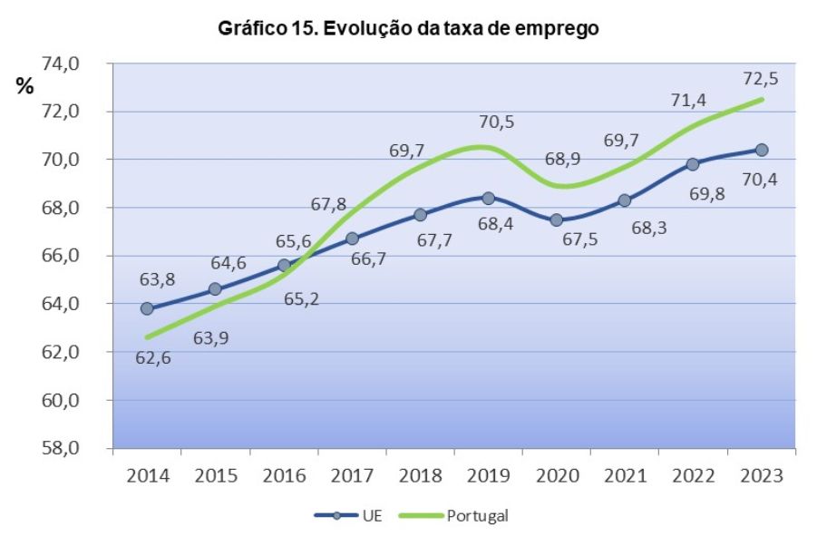 Nos últimos anos, e de acordo com os dados do Eurostat, Portugal tem evidenciado taxas de emprego superiores às da média do conjunto de países da UE. A taxa de emprego portuguesa, que, em 2014 (recuperando do período da troika), registara o valor mais baixo da última década (62,6%), tem vindo a subir gradualmente, não obstante a quebra registada em 2020, devido à situação pandémica. Neste contexto, importa assinalar que este crescimento da taxa de emprego portuguesa tem sido mais expressivo do que o da sua congénere europeia, o que permitiu que Portugal ultrapassasse a média da UE, a partir de 2017. Em 2023, tanto a taxa de emprego portuguesa (72,5%) como a europeia (70,4%) registaram uma subida face ao período anterior, com acréscimos de 1,1 p.p. e 0,6 p.p., respetivamente (Gráfico 15).