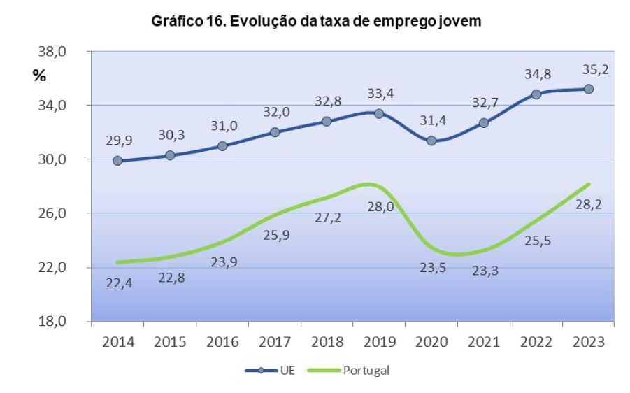 Já menos favorável para Portugal é a evolução da taxa de emprego dos jovens (16 aos 24 anos), que embora tenha crescido como a taxa de emprego da população em geral, exibe sempre valores abaixo dos países da média da UE.