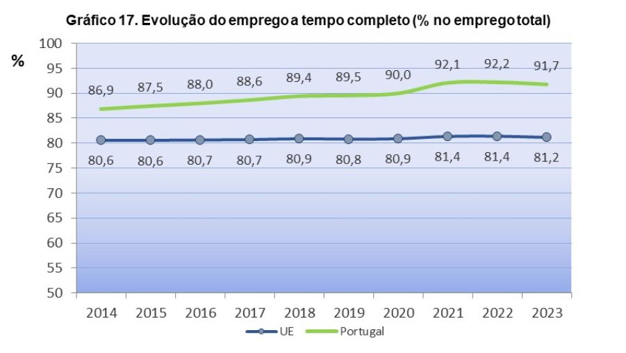 Quanto à duração do trabalho, a população empregada a tempo completo representava, em 2023, cerca de 91,7% do total do emprego, o que correspondeu a 4.633,9 mil pessoas. Face ao ano anterior, observou-se um decréscimo desta população, ao contrário do verificado na população empregada a tempo parcial (Gráficos 17 e 18). Importa realçar que, ao longo do período analisado, a repartição por sexo tem sido assimétrica, pois os homens têm constituído a maioria dos trabalhadores a tempo completo e as mulheres a maioria a tempo parcial.
