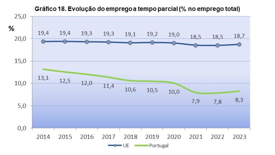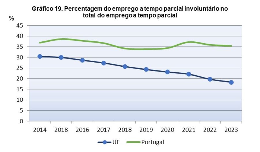 Analisando a percentagem de pessoas empregadas involuntariamente a tempo parcial (16 e mais anos), ou seja, em situação de subemprego3 , tanto em Portugal como na média dos países da UE, observa-se que, ao longo dos últimos dez anos, essa percentagem não só se manteve sempre mais elevada em Portugal, como se acentuou. Com efeito, na UE, a percentagem de pessoas empregadas em situação de subemprego tem vindo a registar uma tendência de decréscimo progressivo, passando de 30,4%, em 2014, para 18,3%, em 2023, enquanto em Portugal, essa percentagem, apesar de algumas oscilações, tem-se mantido praticamente constante, passando de 36,9% para 35,4%, no decurso da última década (Gráfico 19).