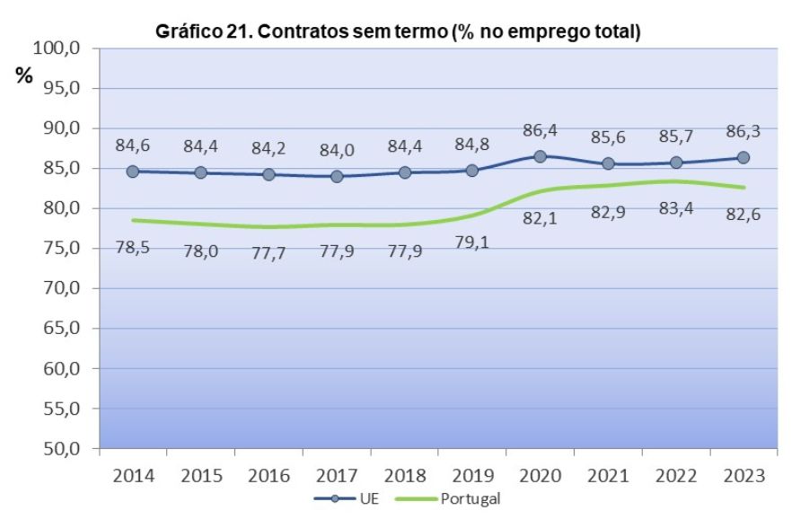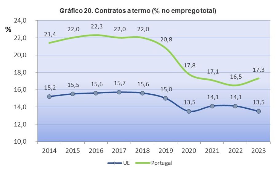 Quanto à duração do vínculo laboral, no conjunto dos países da UE, a percentagem de contratos a termo no emprego total apresentou alguma constância até 2019, registando valores em torno dos 15%. Em 2020, ano de pandemia COVID, após uma quebra de 1,5 p.p., a percentagem de contratos a termo fixou-se nos 13,5%, valor que se voltou a registar em 2023. Em Portugal, essa percentagem tem vindo a evidenciar um comportamento similar, oscilando entre 21% e 22% até 2018, ano a partir do qual se verificou um decréscimo expressivo, que se manteve até 2023 (17,3%) (Gráficos 20 e 21).