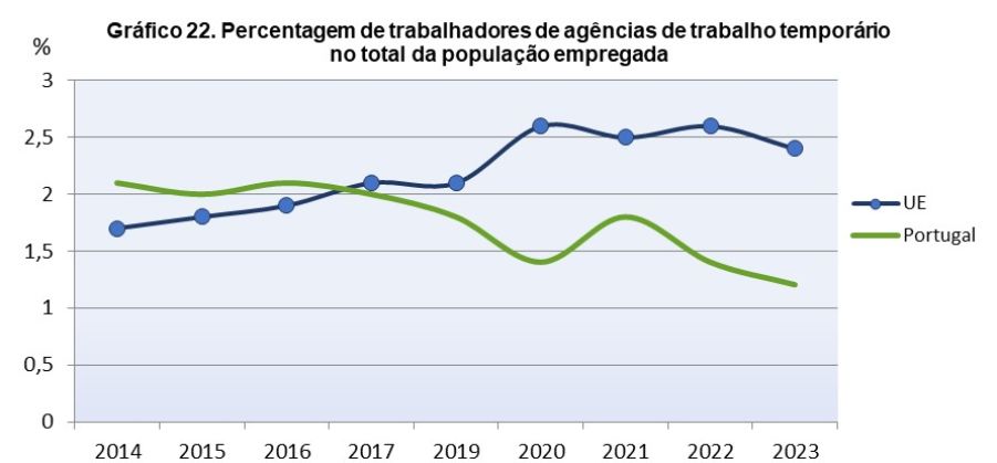 Segundo o Eurostat, em 2023, os trabalhadores das empresas de trabalho temporário, na média dos países da UE, constituíam 2,4% da população empregada, ultrapassando, assim, a percentagem destes trabalhadores em Portugal, que foi de 1,2%. De realçar que, em Portugal, essa percentagem foi superior nas mulheres (1,5% face a 0,9%), ao contrário da UE, onde a percentagem dos trabalhadores masculinos das empresas de trabalho temporário foi superior à das mulheres (2,8% face a 2,1%) (Gráfico 22).