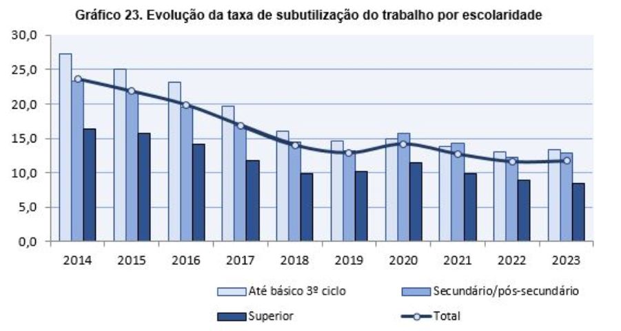 Considerando a informação disponibilizada pelo Inquérito ao Emprego do INE, estima-se que, em 2023, Portugal tenha tido uma taxa de subutilização do trabalho de cerca de 11,7%. Este indicador – que agrega a população desempregada, o subemprego de trabalhadores a tempo parcial, os inativos à procura de emprego, mas não disponíveis e os inativos disponíveis, mas que não procuram emprego – tem vindo a evidenciar um decréscimo progressivo. Com efeito, no espaço de uma década, a taxa de subutilização do trabalho registou uma quebra de 12 p.p., tendo passado de 23,7% em 2014, para 11,7% em 2023.