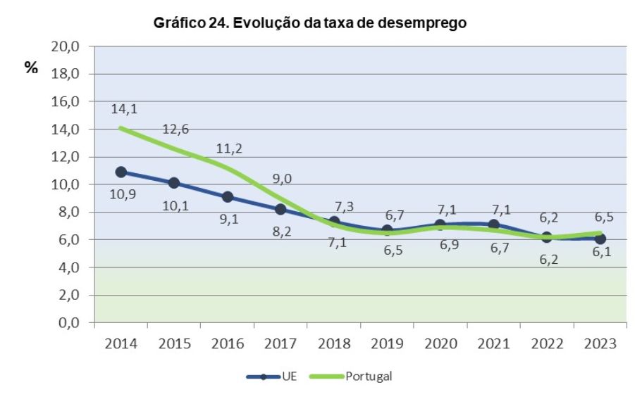 Quanto ao comportamento do desemprego em Portugal, tem-se verificado, ao longo dos últimos dez anos, uma trajetória de decréscimo com uma quebra expressiva, apesar de uma ligeira subida no ano de 2020. De salientar que, a distância entre a taxa de desemprego portuguesa e a europeia, observada há alguns anos, esbateu-se progressivamente, verificando-se, a partir de 2018, uma convergência até 2023, embora o desemprego jovem se situe em níveis elevados em Portugal, divergindo da média da UE.