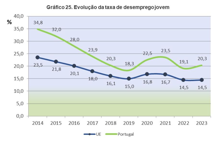 Ao longo da série em análise, a taxa de desemprego jovem portuguesa, à semelhança da taxa de desemprego total, atingiu o valor máximo em 2014 (34,8%), tendo diminuído gradualmente até 2019, ano em que registou 18,3%. Em 2023, esta taxa fixou-se nos 20,3%. No plano europeu, o valor mais elevado da taxa de desemprego dos jovens foi também registado em 2014 (23,5%), ano a seguir ao qual se verificou uma inversão da tendência de crescimento, com os valores mais baixos da série a registarem-se em 2022 e 2023 (14,5%) (Gráfico 25).