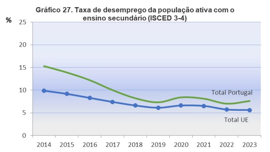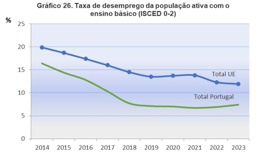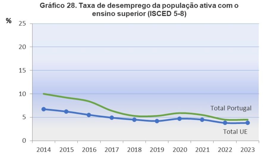Ao longo dos últimos anos, a taxa de desemprego da população ativa portuguesa com o ensino superior tem convergido com a da sua congénere europeia, um pouco à semelhança da tendência observada para os restantes níveis de ensino. Todavia, se a taxa de desemprego da população portuguesa com o ensino secundário e o superior permanecem ligeiramente acima da taxa europeia, o mesmo não sucede com a taxa de desemprego da população com o ensino básico, onde a UE tem tido sempre valores superiores ao de Portugal, com variações expressivas em alguns anos (Gráficos 26 a 28).