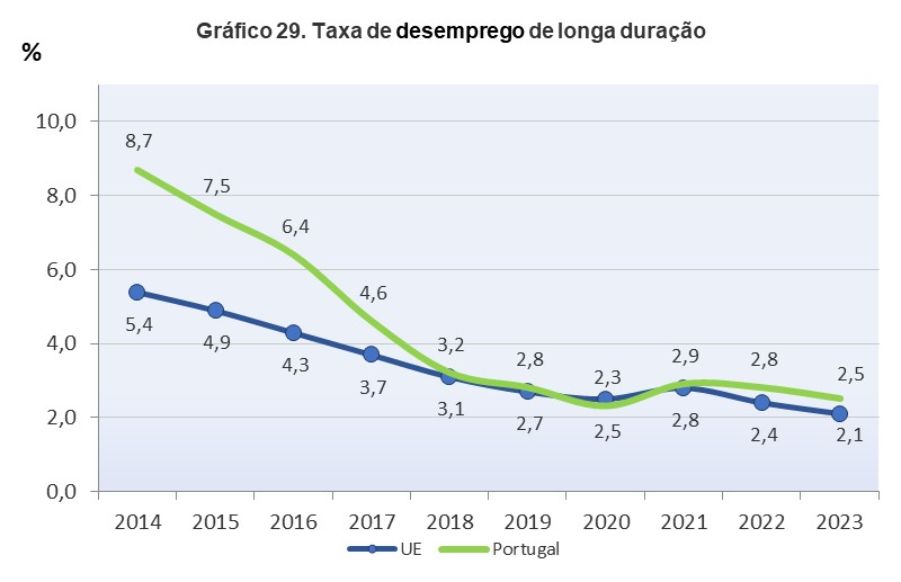 Por último, importa referir que, após o acentuado decréscimo observado há cerca de dez anos, a taxa de desemprego de longa duração em Portugal tem vindo a apresentar uma certa constância de valores entre os 2% e os 3%. Com efeito, no espaço de uma década, assistiu-se ao recuo desta taxa, que passou de 8,7%, em 2014, para 2,5%, em 2023. Quando comparada com a taxa da média dos países da UE, a taxa portuguesa apresenta um valor superior, apesar de, desde 2014, essa diferença ter vindo a esbater-se (Gráfico 29).