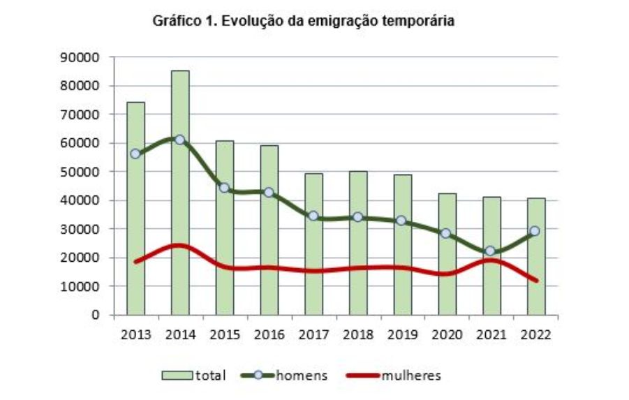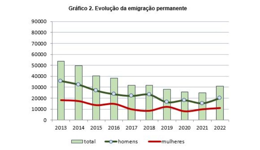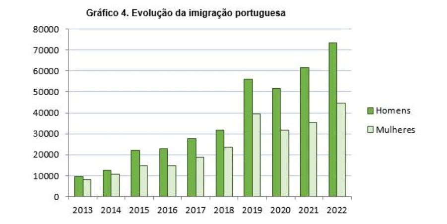 Relativamente aos emigrantes portugueses, observa-se uma acentuada subida até 2014, ano a partir do qual se verificou uma inflexão desta trajetória, que se manteve até 2021. De notar que, em 20222 , segundo as estimativas do INE, o número de emigrantes portugueses registou uma subida de 8,7% (mais 5,7 mil emigrantes) face ao ano anterior, contrariando, assim, a tendência de decréscimo que se vinha verificando.