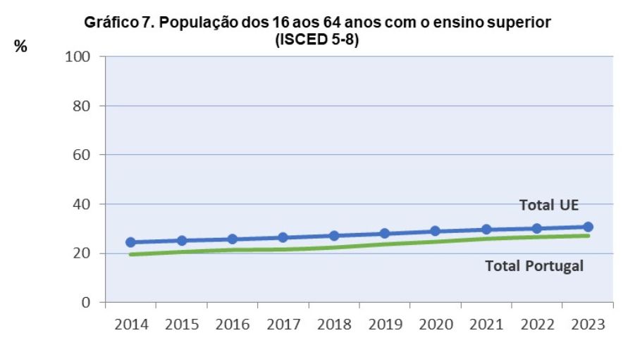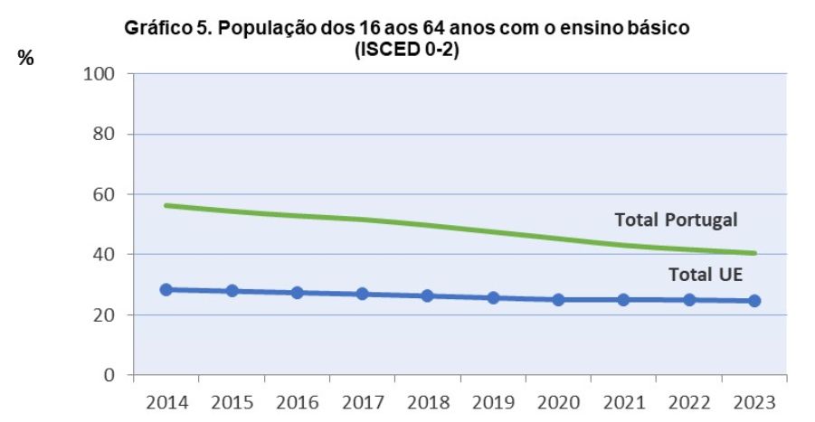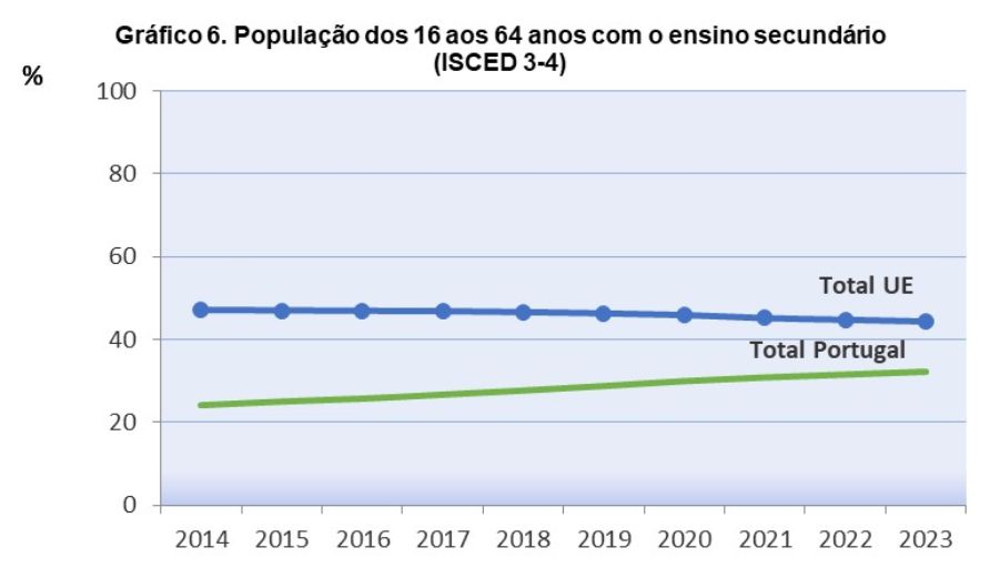 Ainda neste contexto, a análise dos níveis de escolaridade e qualificação da população em idade ativa, coloca em evidência que, na última década, a população portuguesa dos 16 aos 64 anos com níveis de escolaridade mais baixos regrediram, em contraponto com os superiores. Com efeito, no que respeita aos níveis de escolaridade da população, ao longo dos últimos anos, Portugal convergiu com a média da União.