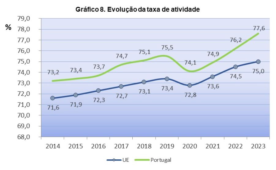 Relativamente à população ativa, tem-se assistido a sucessivos acréscimos desde 2016, à exceção de 2020, ano da eclosão da pandemia de COVID-19. Ao longo da última década, a taxa de atividade em Portugal tem vindo a aumentar de forma gradual, apresentando valores entre os 73% e os 77,6%, à semelhança do que vem sucedendo com a média dos países europeus, onde se evoluiu de 71,6%, em 2014, para 75%, em 2023. De notar que, relativamente a esta taxa, Portugal tem registado, sempre, valores superiores aos da média dos países da União Europeia (Gráfico 8).
