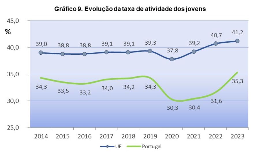 A partir de 2020, observam-se sinais de recuperação, embora com ritmos de crescimento diferentes em Portugal e na média dos países da UE. Merece destaque o último ano desta série, 2023, quando comparativamente a 2022, a taxa de atividade jovem portuguesa subiu para os 35,3% (mais 3,7 p.p.) e a europeia para os 41,2% (mais 0,5 p.p.) (Gráfico 9).