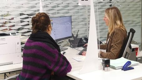 • Empleada pública atendiendo en un mostrador a 2 personas