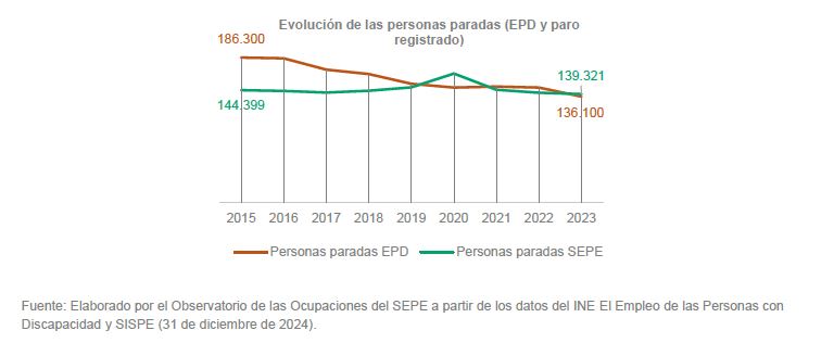 En cuanto al desempleo EPD, a finales de 2024, había 135.417 personas con discapacidad en paro, lo que supuso un 5,29 % del total de parados. El número de desempleados en este colectivo disminuyó en 3.904 respecto al año anterior.