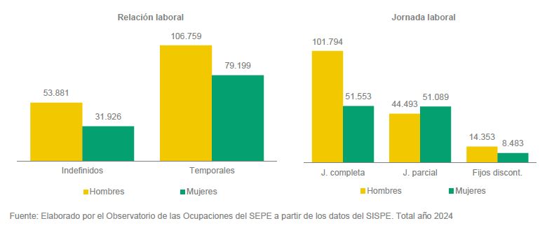 Aunque la contratación total del colectivo disminuyó en 2.275 contratos (-0,83 %), se observa un incremento en la contratación indefinida ordinaria, tanto a tiempo parcial (1,47 %) como a tiempo completo (2,50 %). Sin embargo, la tasa de estabilidad se sitúa en 31,57 %, muy por debajo de la media nacional (42,04 %), lo que refleja una alta temporalidad: 68,43 % de los contratos son temporales frente al 31,57% indefinidos. Por tipo de jornada los resultados en 2024 fueron: a jornada completa (153.347) el 56,43 %, a jornada parcial (95.582) el 35,17 % y los fijos discontinuos (22.836) el 8,40 %.