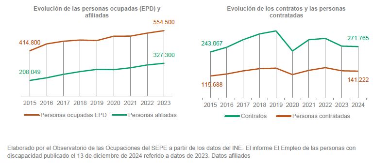 En 2023, el número de personas afiliadas con discapacidad aumentó en 119.251 respecto a 2015, mientras que el número de personas ocupadas aumentó en 139.700. Este avance se refleja también en la tasa de empleo que pasó de un 23,4 % en 2015 a un 28,5 % en 2023, un incremento de 5,1%, aunque todavía por debajo de la media nacional.