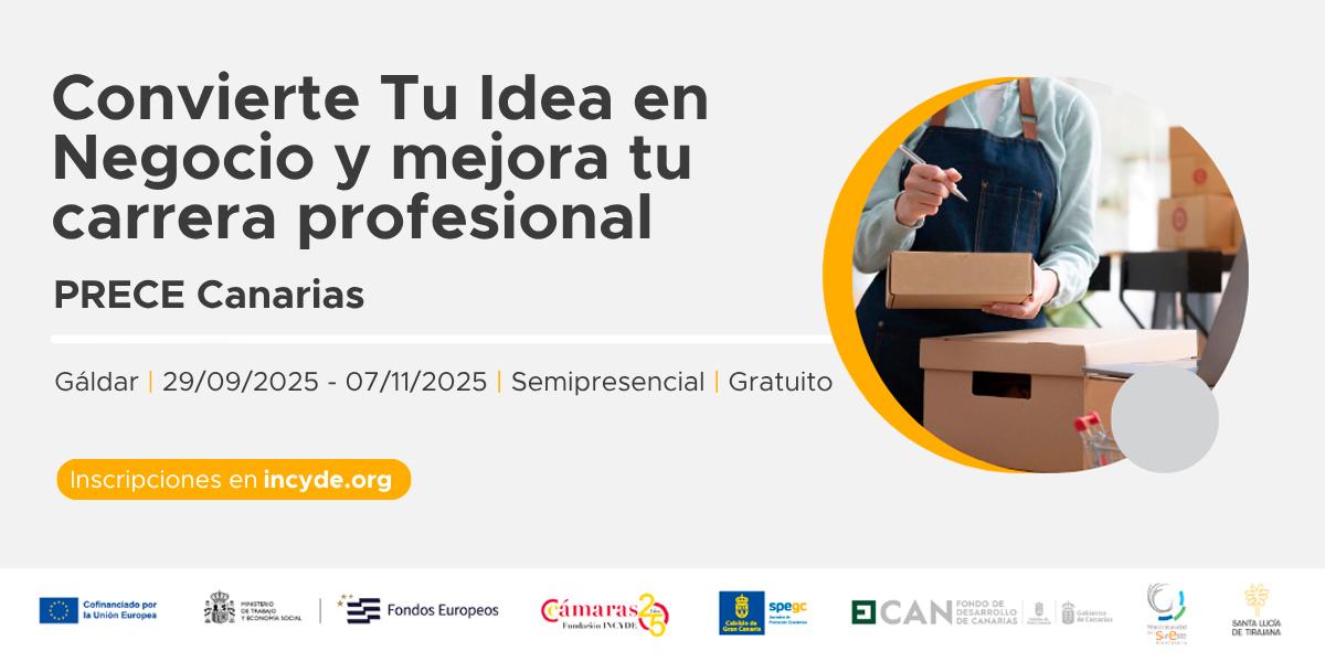 PRECE CANARIAS. Convierte Tu Idea en Negocio y mejora tu carrera profesional. el curso es de carácter semipresencial, tiene una duración de de 6 semanas y se desarrollará en Santa Lucía de Tirajana y en Gáldar.