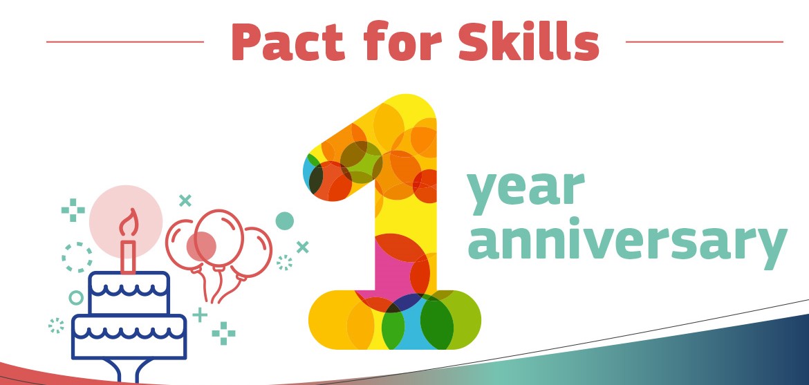 Hoy, el Pacto celebra su primer cumpleaños y las sólidas alianzas ya construidas están creando más oportunidades para que las personas en edad laboral en toda Europa aprendan nuevas habilidades y mejoren sus perspectivas en el mercado laboral y en el trabajo: 450 organizaciones se han comprometido a proporcionar las habilidades adecuadas para 1,5 millones de personas.