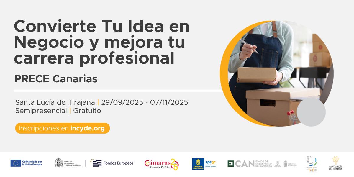 PRECE CANARIAS. Convierte Tu Idea en Negocio y mejora tu carrera profesional. el curso es de carácter semipresencial, tiene una duración de de 6 semanas y se desarrollará en Santa Lucía de Tirajana y en Gáldar.
