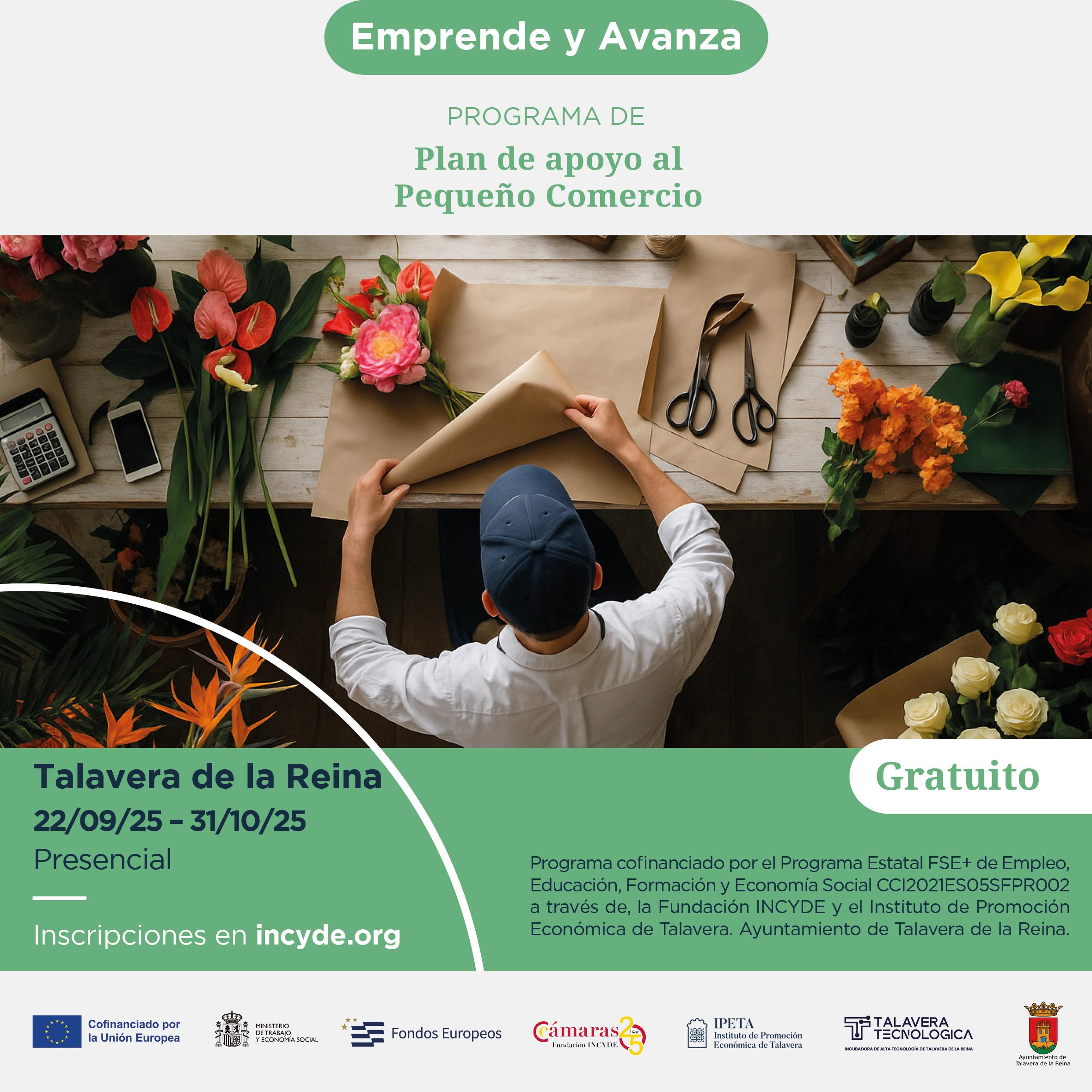 El programa está cofinanciado por el FSE+, Programa Estatal de Empleo, Educación, Formación y Economía Social CCI2021ES05SFPR002 a través de la Fundación INCYDE y el Instituto de Promoción Económica de Talavera. Ayuntamiento de Talavera de la Reina.
