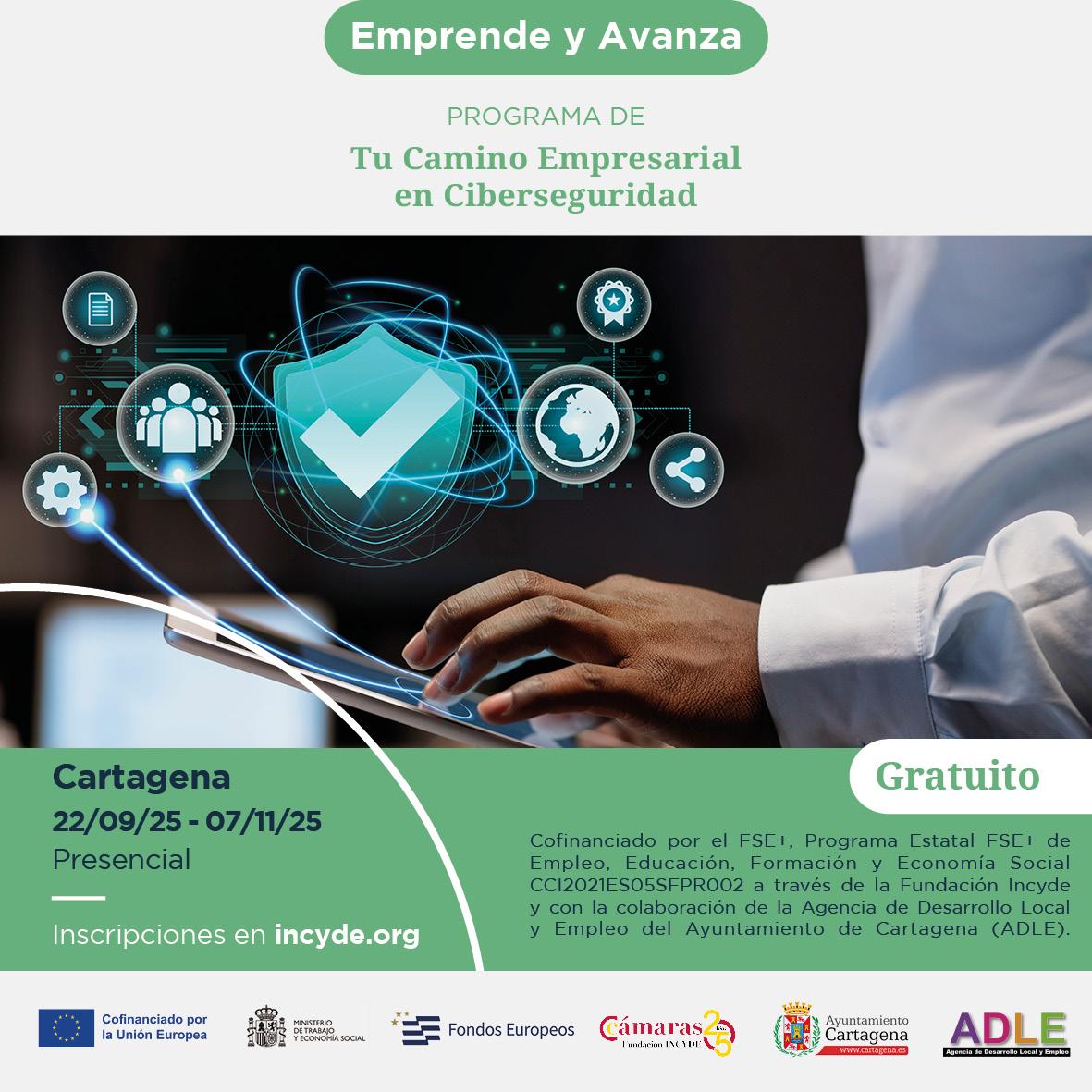 Programa "Tu camino empresarial en Ciberseguridad". Cartagena. Presencial, tiene una duración de 7 semanas (6 semanas presenciales más una semana de Trabajo de Campo). Está dirigido a personas vinculadas al mundo tecnológico y con interés en conocer la importancia de la ciberseguridad en una economía y una sociedad cada vez más digitalizadas; a personas emprendedoras que cuenten con una idea de negocio y deseen realizar un proyecto viable de creación de empresa para su posterior puesta en marcha y a empresarios/as de PYMES que quieran consolidar su negocio, mejorar la rentabilidad de su empresa o evaluar otras alternativas de expansión, todo con el objetivo de brindar formación de alta calidad con el objetivo de facilitar metodologías y herramientas relativas a la seguridad de los sistemas de información y liderazgo emprendedor como herramientas de trabajo de valor añadido para la empleabilidad y la competitividad.