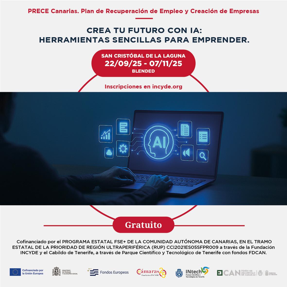 Crea tu futuro con IA. Herramientas sencillas para emprender. San Cristóbal de la Laguna y Arucas. Semipresencial, se desarrollará en estas dos localidades. Se dirige a calquier persona que cuente con una idea de negocio o que quiera ampliar sus conocimientos en inteligencia artificial para facilitar su incorporación al mercado laboral y a emprendedores/empresarios que quieran consolidar su negocio, mejorar la rentabilidad de su empresa o evaluar otras alternativas de expansión aprovechando la inteligencia artificial. Sus objetivos son: desarrollar un Modelo de Negocio basado en el aprovechamiento de nuevas oportunidades, formar a los participantes en técnicas efectivas de gestión de empresas, entender la importancia de la IA en la estrategia de adquisición de datos, automatización de procesos y tareas y en la creación de nuevos perfiles y puestos de trabajo, conocimientos de herramientas de IA para la transformación digital de la empresa, optimización de SEO y SEM, atención al cliente, generación de contenido.
