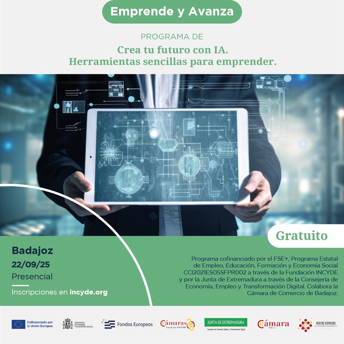 Programa Crea tu futuro con IA. Herramientas sencillas para emprender. Badajoz. El curso es presencial y tiene una duración de 7 semanas (6 semanas presenciales más una semana de Trabajo de Campo). Se dirige a cualquier persona que tenga una idea de negocio o que quiera mejorar sus conocimientos de Inteligencia Artificial para mejorar su proyecto empresarial y oportunidades profesionales y a emprendedores y/o empresarios que quieran consolidar su negocio, mejorar la rentabilidad de su empresa, diseñar o controlar un proyecto de transformación digital y sus objetivos son los de contar con los conocimientos básicos necesarios para desarrollar una actividad por cuenta ajena o propia como gestor de proyectos en medianas y pequeñas empresas industriales y proporcionar la formación teórica, la capacitación tecnológica básica y el conocimiento práctico, contando con el adecuado apoyo y monitorización.