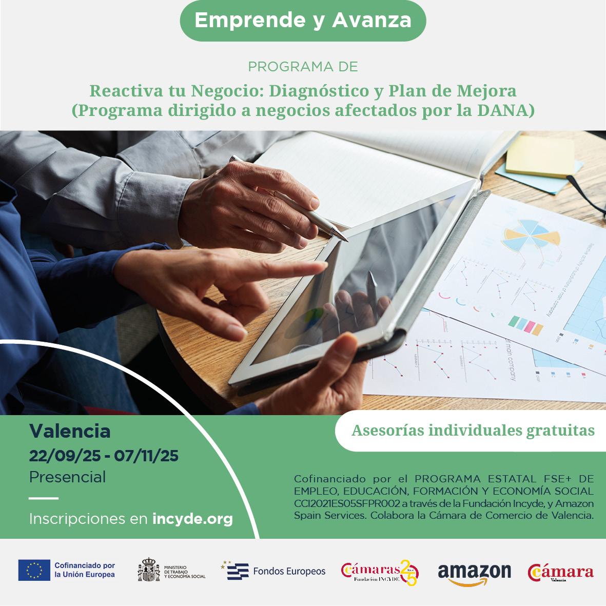Diagnóstico y Plan de Mejora (programa dirigido a los negocios afectados por la DANA). Valencia. Presencial, tiene una duración de 7 semanas (6 semanas presenciales más una semana de Trabajo de Campo). Se dirige a negocios afectados por la DANA de Valencia con los objetivos, entre otros, de promover la recuperación económica de los negocios mediante herramientas que visibilicen su reapertura, dotar de las herramientas necesarias para redirigir sus actividades hacia la digitalización o proporcionar estrategias de gestión financiera para enfrentar la crisis y planificar la recuperación económica.