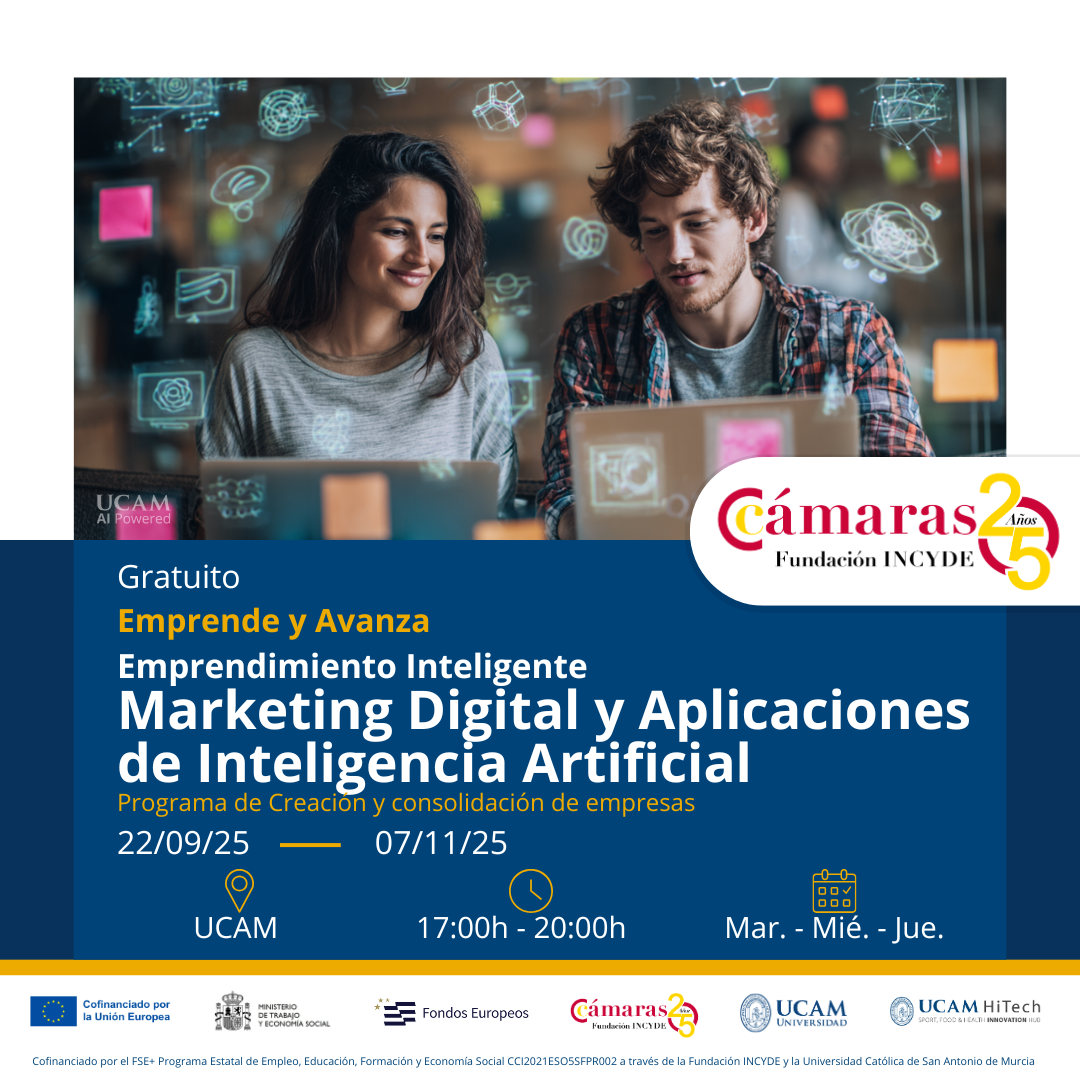 ProgramaEmprendimiento Inteligente. Marketing Digital y Aplicaciones de Inteligencia Artificial. Murcia. Presencial, tiene una duración de 7 semanas (6 semanas presenciales más una semana de Trabajo de Campo). Se dirige a cualquier persona que cuente con una idea de negocio o que quiera ampliar sus conocimientos en marketing digital e inteligencia artificial para mejorar su proyecto empresarial y oportunidades profesionales y a emprendedores/Empresarios/as que quieran consolidar su negocio en, mejorar la rentabilidad de su empresa en diseñar o evaluar otras alternativas de expansión aprovechando las herramientas del marketing digital y la inteligencia artificial, todo con los objetivos de formar a los participantes en técnicas efectivas de gestión de empresas y de entender los fundamentos esenciales de la IA y la importancia de la implantación de una correcta estrategia de Marketing Digital y utilización de herramientas de IA en la estrategia de adquisición de datos, automatización de procesos y tareas y en la creación de nuevos perfiles y puestos de trabajo.