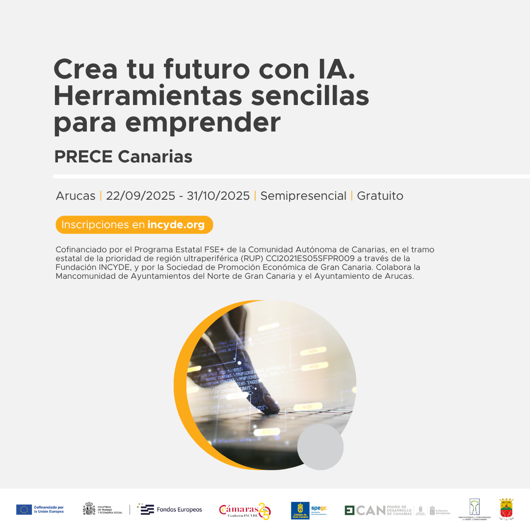 Programa cofinanciado, en el caso de Arucas por por el Programa Estatal FSE+ de la Comunidad Autónoma de Canarias, en el tramo estatal de la prioridad de región ultraperiférica (RUP) CCI2021ES05SFPR009 a través de la Fundación INCYDE, y por la Sociedad de Promoción Económica de Gran Canaria. Colabora la Mancomunidad de Ayuntamientos del Norte de Gran Canaria y el Ayuntamiento de Arucas.