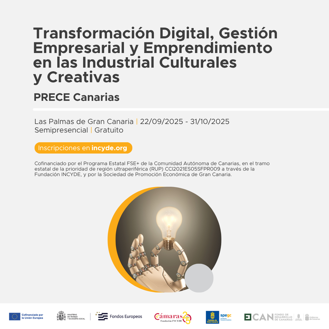 Transformación digital, Gestión Empresarial y Emprendimiento en las Industrias Culturales y Creativas. Las Palmas de Gran Canaria. Presencial, con una duración de 6 semanas. Se dirige a cualquier persona que tenga una idea de negocio o que quiera mejorar sus conocimientos de transformación digital en el sector cultural para mejorar su proyecto empresarial y oportunidades profesionales y a emprendedores y/o empresarios que quieran consolidar su negocio, mejorar la rentabilidad de su empresa, diseñar o controlar un proyecto de transformación digital.